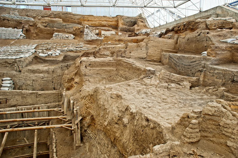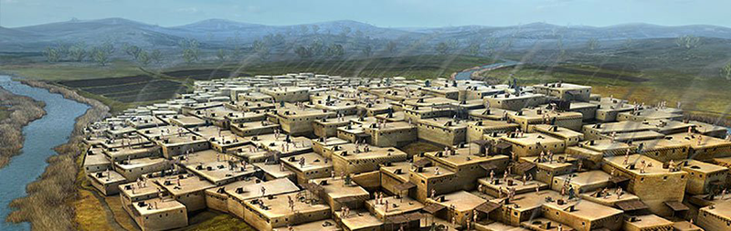 The inhabitants of Catalhoyuk lived in mud-brick and timber houses built around courtyards. The village had no streets or alleyways. Houses were packed so close together people entered their houses through their roofs and often went from place to place via the roofs, which were made of wood and reeds plastered with mud and often reached by ladders and stairways.